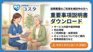 サービス内容、ご利用料金、対応エリア、各種加算、キャンセル規定、相談窓口などを掲載しておりますので、訪問看護のご利用を検討されている方やご家族の皆さまは、事前確認資料としてご活用ください。